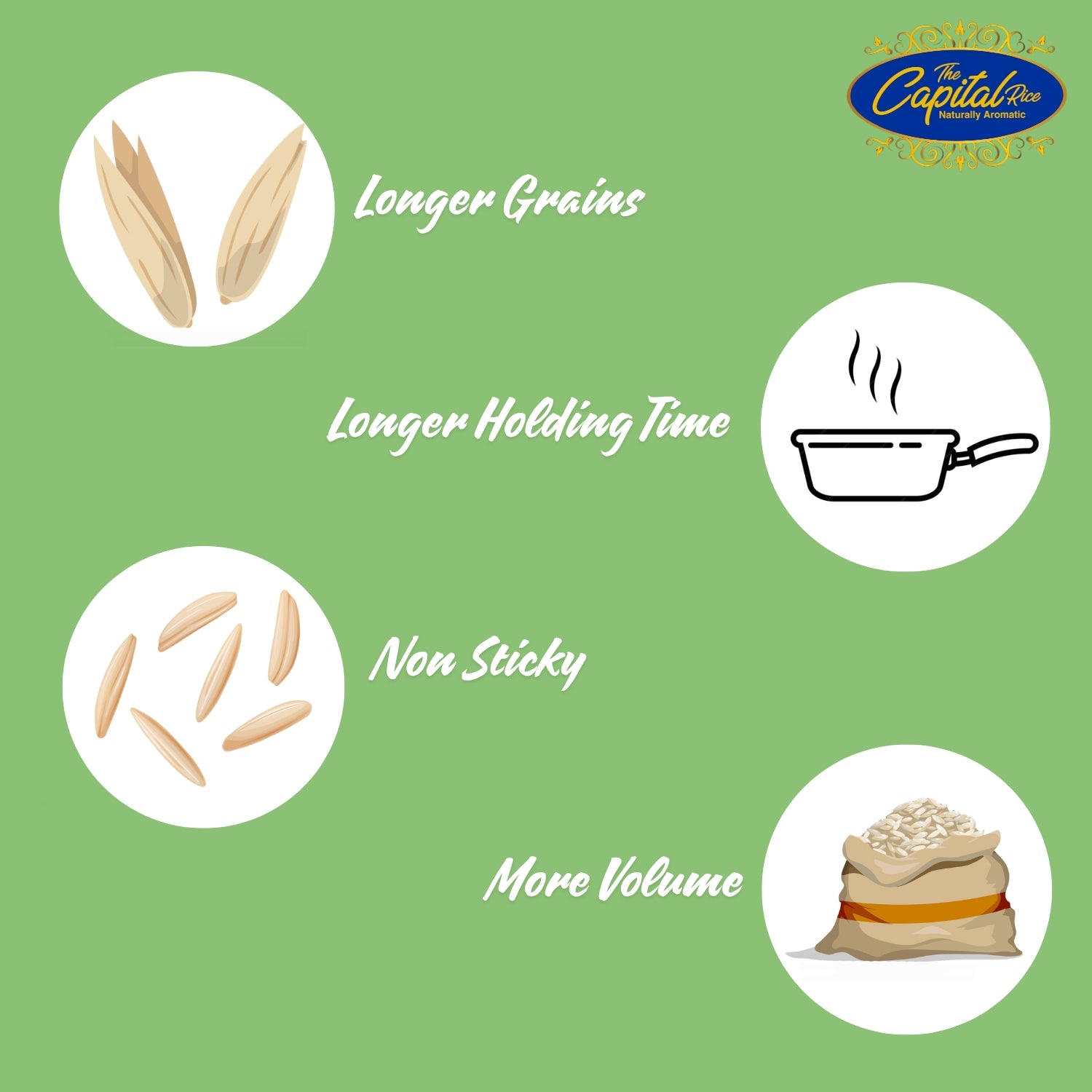 AGED 1121 Basmati Rice has the world’s longest grain, before as well as after cooking and gives 30% more volume than any other Basmati variety. 1121 Basmati Rice grade is known worldwide for its long length, excellent cooking qualities, unique aroma, special sweet taste and high nutritional value. Capital Classic has been aged up to 2 years to bring you the authentic basmati experience.