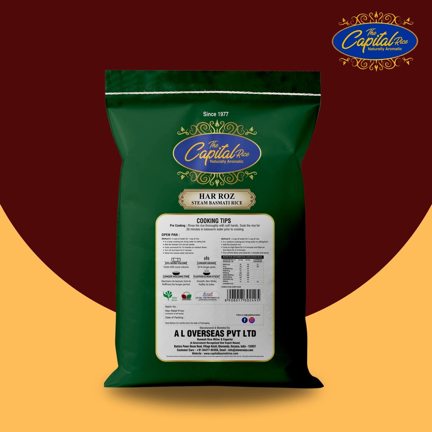AGED 1121 Basmati Rice has the world’s longest grain, before as well as after cooking and gives 30% more volume than any other Basmati variety. 1121 Basmati Rice grade is known worldwide for its long length, excellent cooking qualities, unique aroma, special sweet taste and high nutritional value. Capital Classic has been aged up to 2 years to bring you the authentic basmati experience.